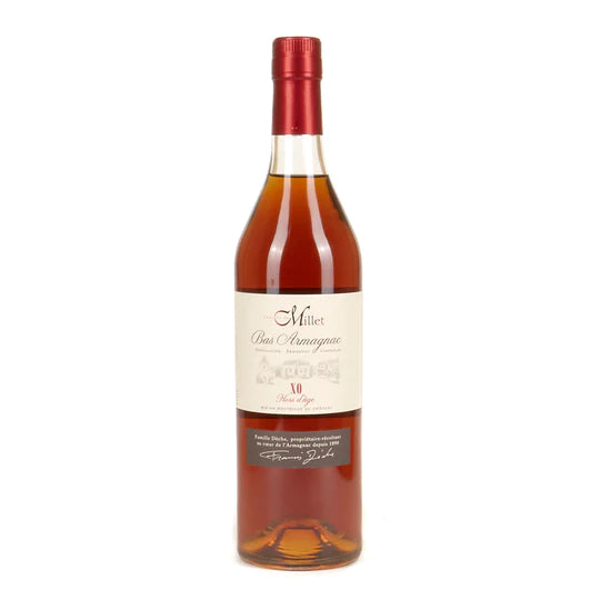 Mahogany gold color. Rich nose of dried fruits and cooked prunes. The palate is complex and velvety, supported by notes of toasted hazelnut. The finish has a lot of substance and ends on a very nice length. This Hors d'Age is the alliance of the best Millet Armagnacs aged in barrels for 15 to 25 years.